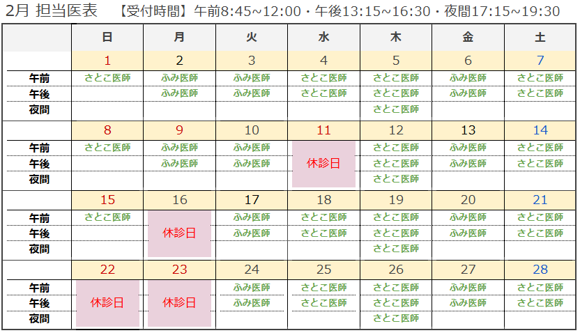 2月1日(日)・7日(土)・8日(日)・28日(土)9時から16時30分までの診察