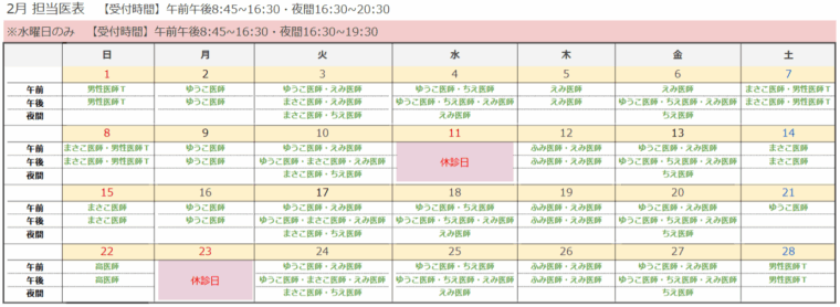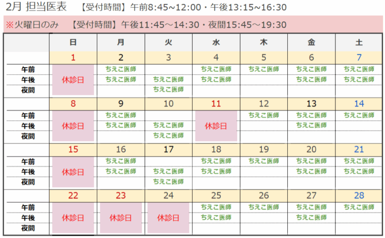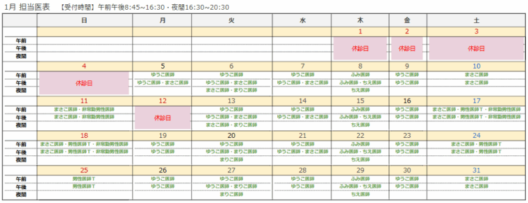 1月・2月の休診日については以下の通りとなります。担当医について、詳しくは下記の担当医表をご覧ください。
