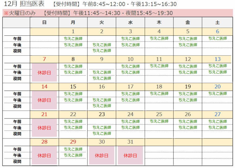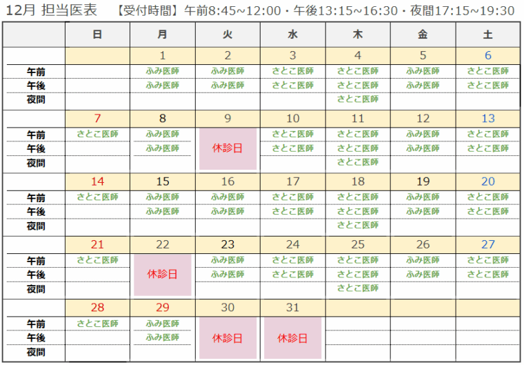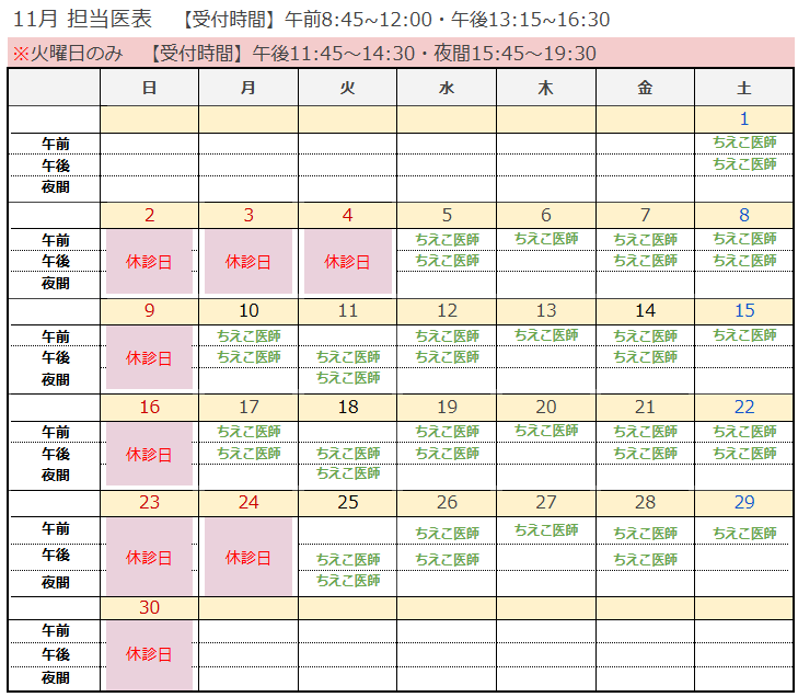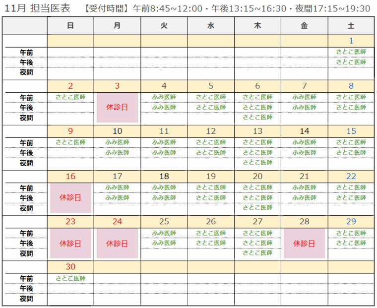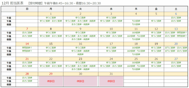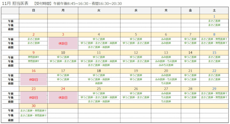 11月・12月の休診日については以下の通りとなります。担当医について、詳しくは下記の担当医表をご覧ください。