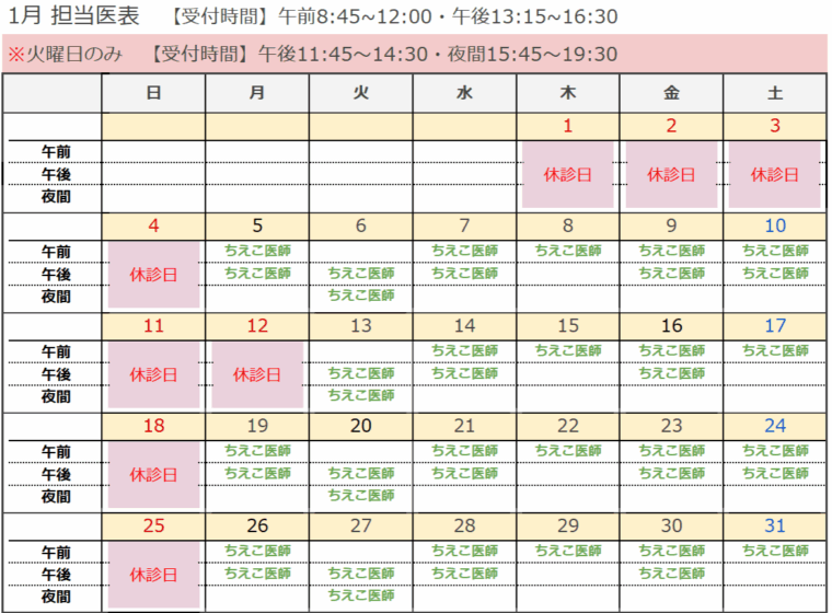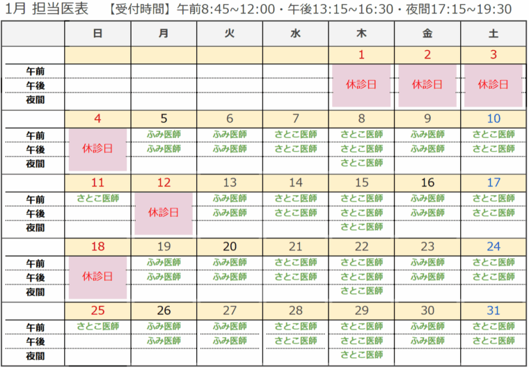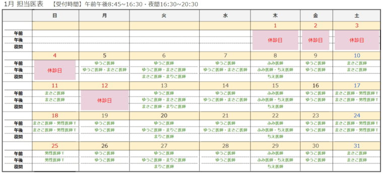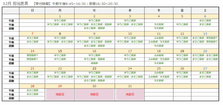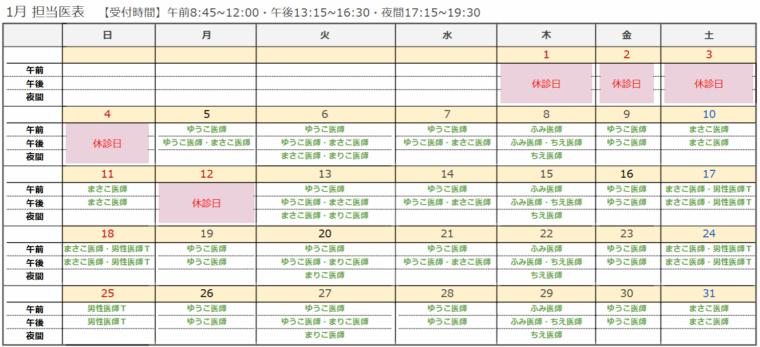 12月・1月の休診日については以下の通りとなります。担当医について、詳しくは下記の担当医表をご覧ください。